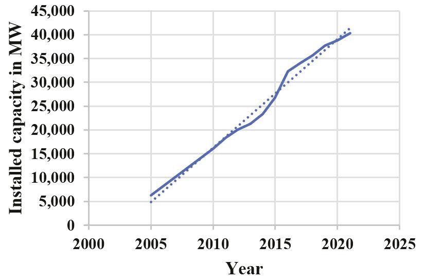 kinetic energy is transferred to an attached generator, which then produces usable electrical current. The generator links to the transmission. The generator generates electrical power, which is then sent to a transformer. The transformer raises the voltage of the electricity, and then the electricity goes to the power system. The management system of the wind power plant acts as a measure for the performance of the turbine, ensuring that it continues to function in an effective and secure manner at all times. In addition to this, it alters the inclination of the blades so that the amount of power generated is maximized in accordance with the speed and direction of the wind [9], [10]. However, the growth of thermal power plants, as shown in Figure 1.1, is comparable to the growth of wind power plants, as shown in Figure 1.2.