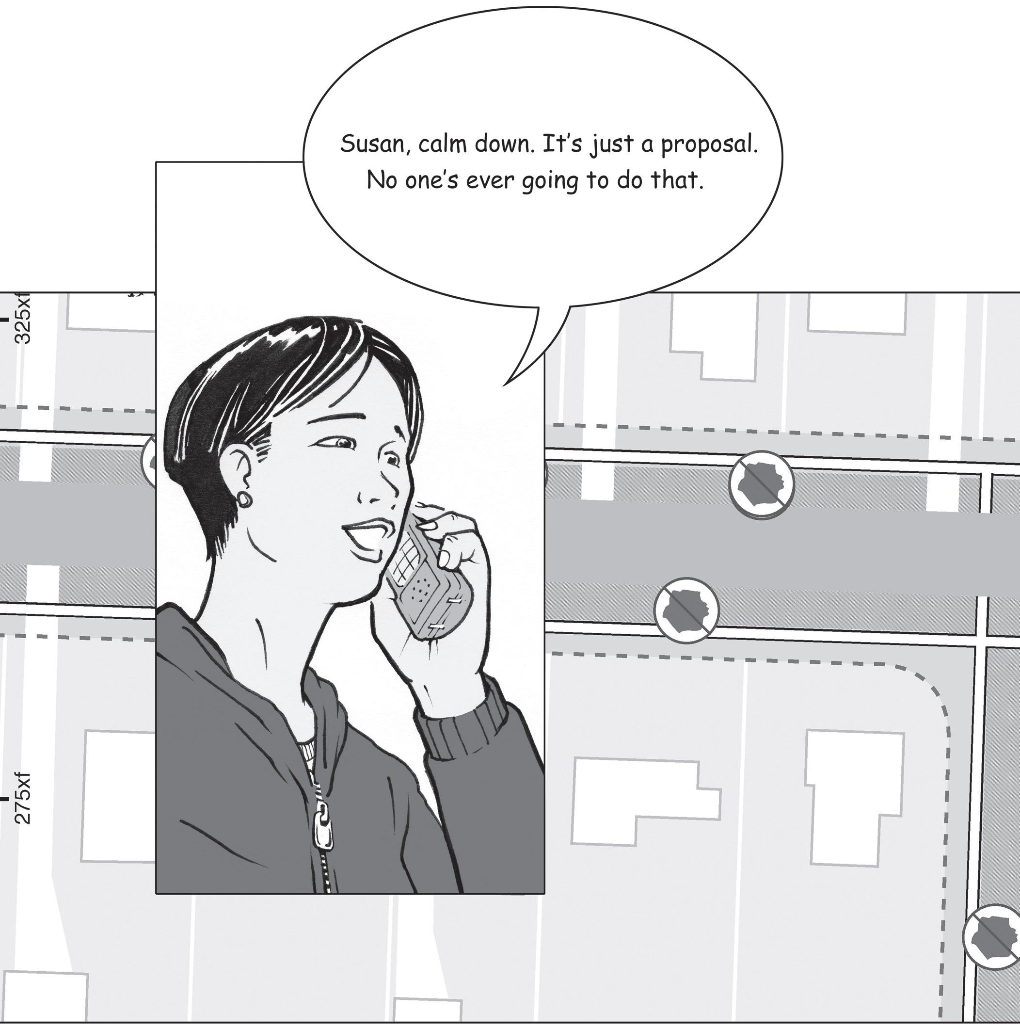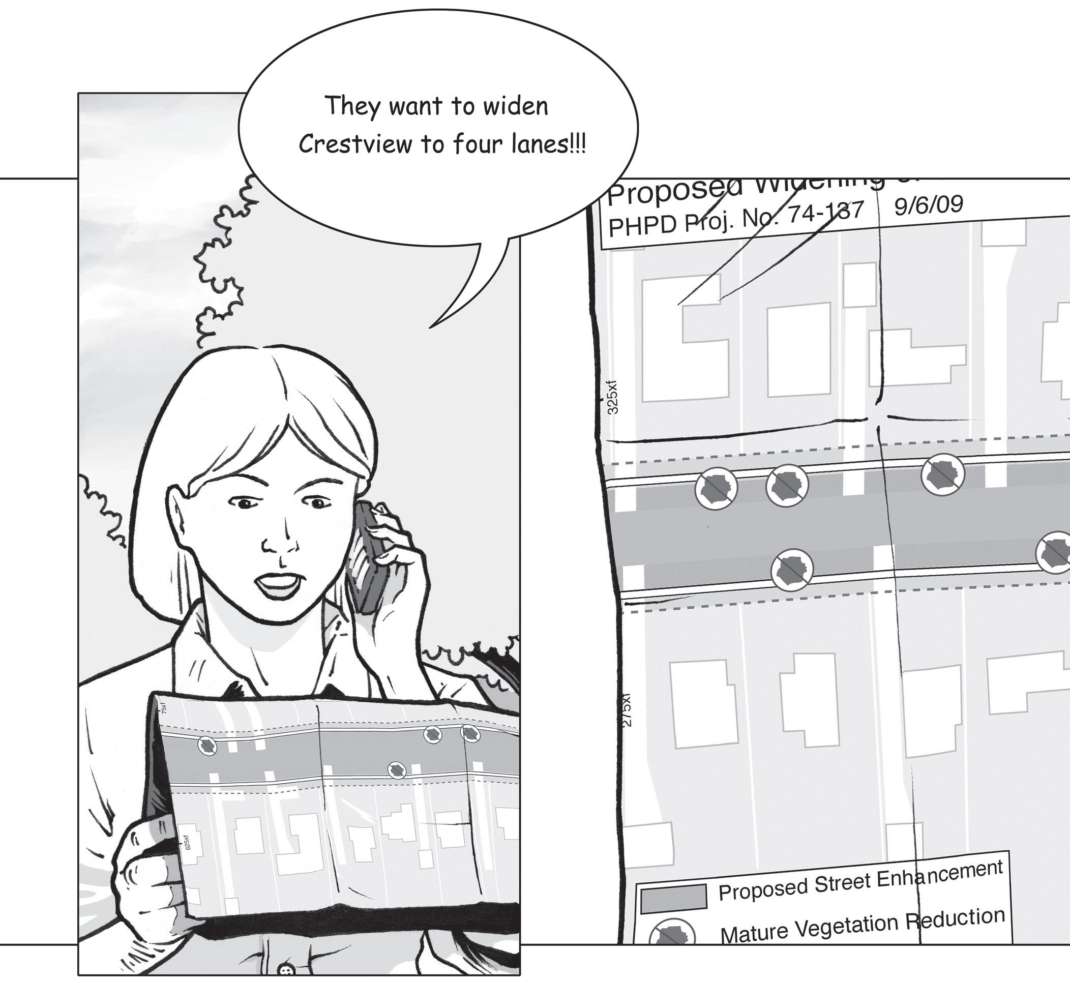 People communicate about their places with maps. Less common than talk or writing, maps are made when called for by social circumstances. Jaki and Susan are making maps to protect their neighborhood. Why a map? Because the city used a map. The map unambiguously expresses the city’s intentions to widen Crestview Road, drawing from the maps, talk, and text of city planners. If the plan is realized, the city will also use maps to communicate its intentions to surveyors, engineers, contractors, utility companies, and others.