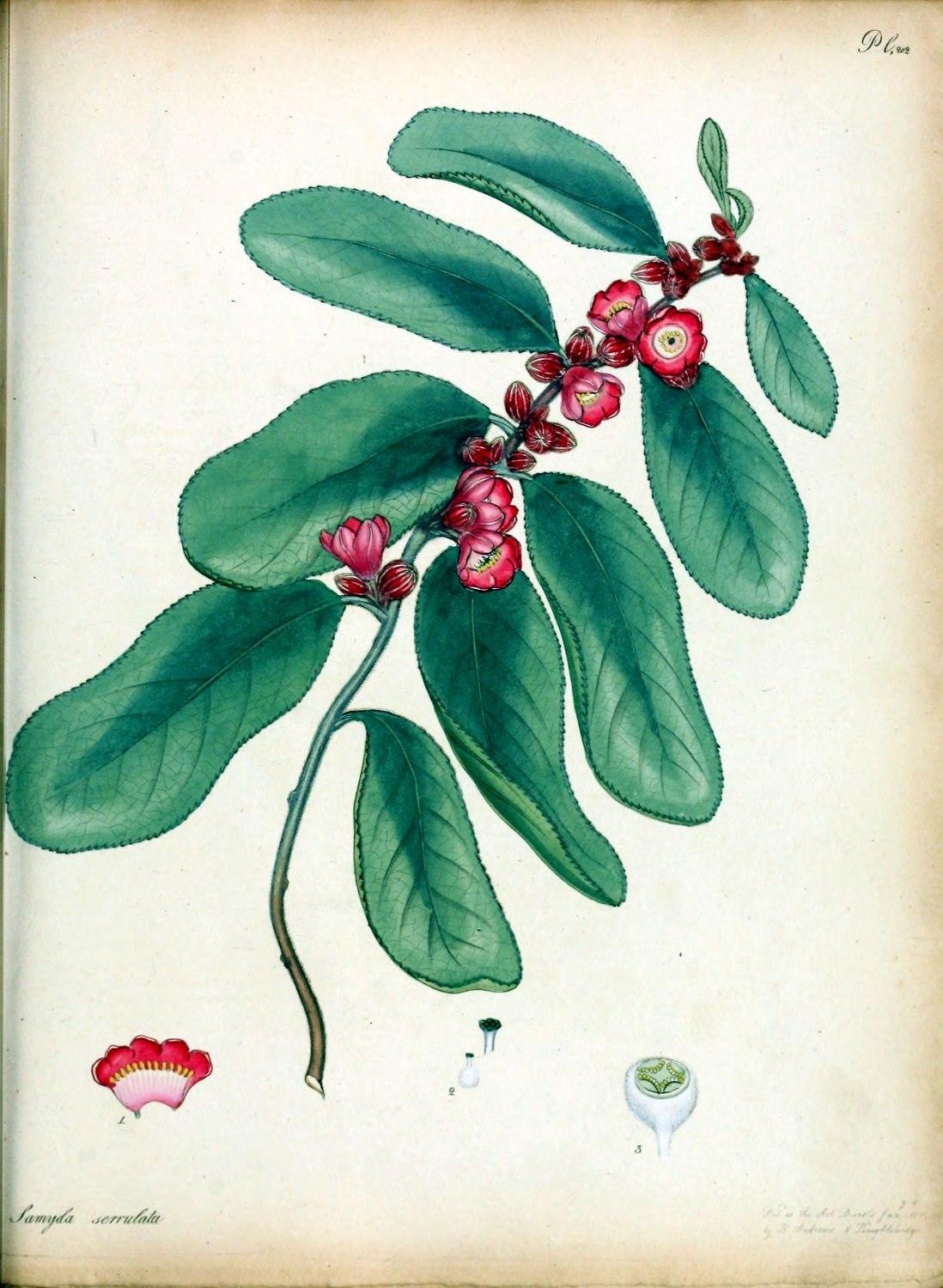 Samyda with rosy coloured flowers having twelve chives; leaves between egg-shaped and oblong, slightly sawed.