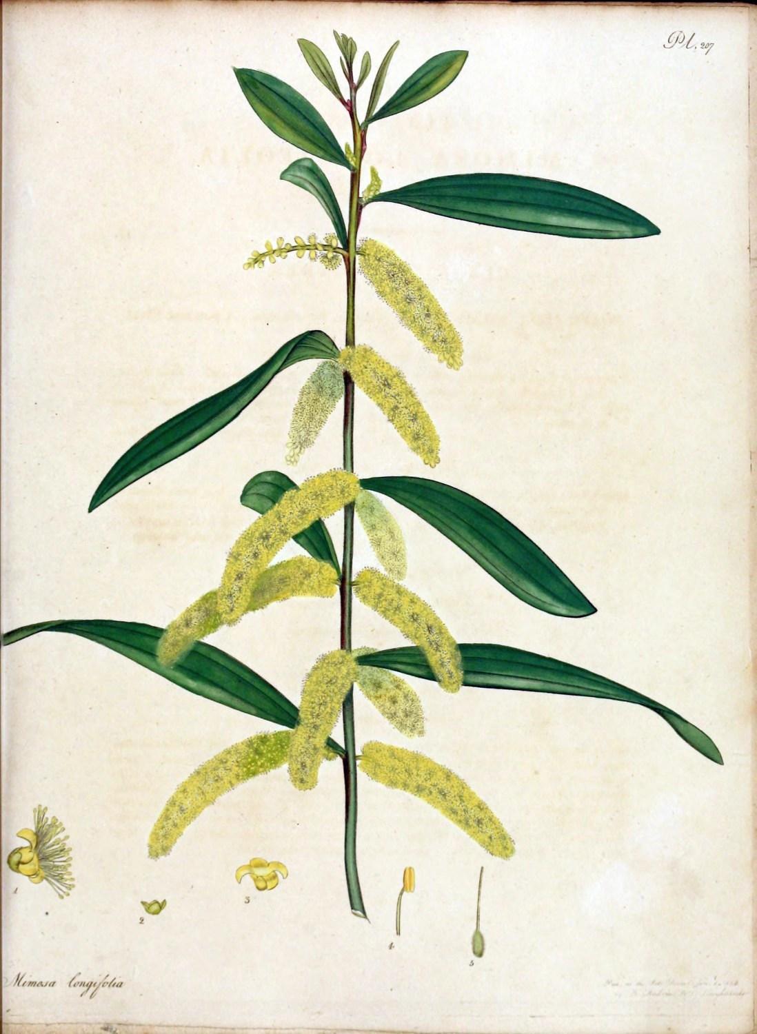 About the year 1792 J. Ord, Esq. of Pursers Cross, Fulham, received the seeds of this Mimosa from New South Wales; the plants were raised, the ensuing year, by Mr. White, who has managed, much to his credit, the select collection of that Gentleman near 20 years, and who obligingly sent us a fine specimen in March 1801, taken from a plant near 18 feet in height. Of the Mimosas now in Britain, we think, this species is likely to exceed them all in height; making a very handsome plant; and most beautiful at the season when covered with its long pendulous bunches of flowers. It is increased by cuttings, but with difficulty; and, as yet, seeds have not been perfected in this country. A light sandy earth is what it thrives in most, but it will grow in almost any soil.