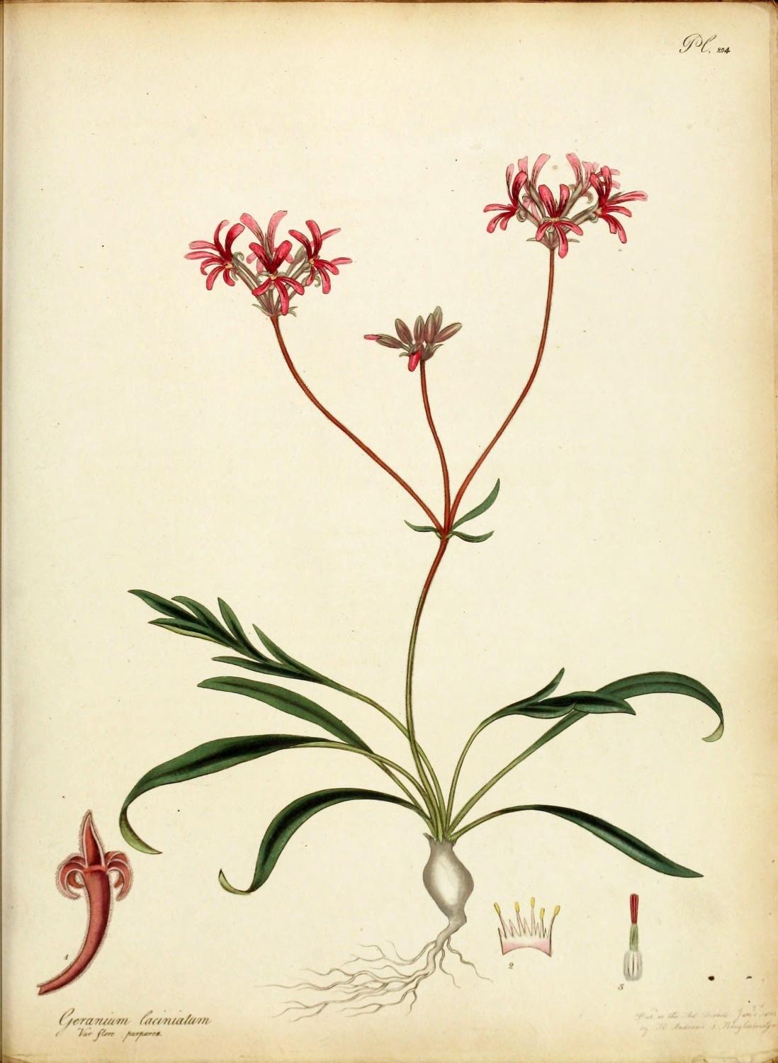 T very handsome variety, (for we cannot consider it as a species,) of the Geranium laciniatum, was imported in 1800, from the Cape of Good Hope, by G. Hibbert Esq.; in whose collection it flowered, last year, in the month of June, when our drawing was taken; and we believe it is in no other at
