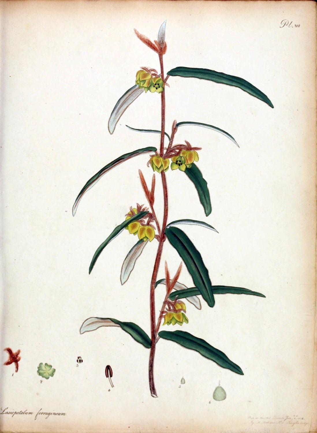 T singularity of this plant recommends it to our notice, rather than its beauty. It is a native of New South Wales, near Port Jackson, and is found in marshy grounds; where its branches are seen to extend many yards, embracing all the under shrubs they meet; they seldom exceed the size of small twine, but are exceeding tough. The whole plant, when old, has a dirty or rusty brown appearance, the leaves becoming very small and narrow; although from culture in this country, we have seen the leaves, on some plants, near an inch in breadth, and three in length. For the Generic and Specific titles of this plant we are indebted to Dr. Smith, P. L. S. &c. and we do not think more appropriate ones could have been invented. The giving specific names and characters to plants, where only one has been discovered of the Genus, although a little from Linnæan principles, we must confess accords with our ideas; for, although, to compare is necessary to distinctive difference; yet, if the most ostensible, and novel appearance of the parts, are taken from the first discovered plant, for the specific character; there is no more danger of confusion, from any addition to the Genus, than if no such observations had been made; for, what must in future be taken as specific distinction must arise from an opposition to the first plant on which the Genus was founded: wherefore we have adopted this manner, from the commencement of the work. This plant was first raised at the Hammersmith Nursery, from seeds received from New South Wales in 1791. It is