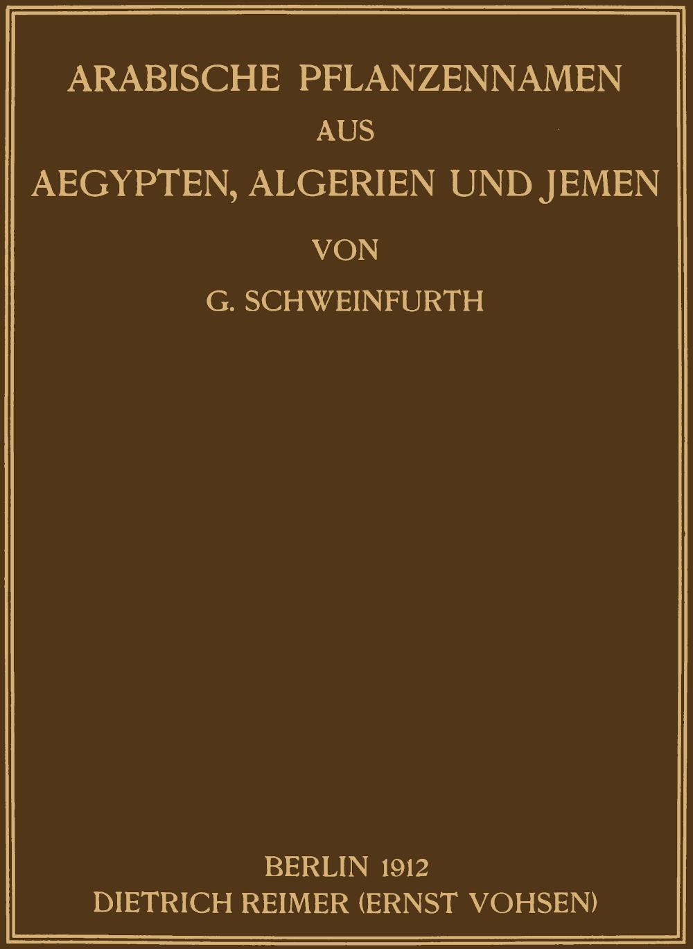 In unserer 1887 in den Denkschriften des Institut Egyptien zu Cairo veröffentlichten „Illustration de la flore d’Egypte“ sind in Gemeinschaft mit P. ASCHERSON von mir alle uns aus eigener Erfahrung sowie aus der uns zugänglichen, Aegypten behandelnden Literatur bekannt gewordenen arabischen Pflanzennamen, soweit sie für das eigentliche Aegypten Geltung hatten, eingetragen worden. Obgleich wir meist darauf bedacht waren, bei den nicht von uns selbst erkundeten Namen durch Angabe der Gewährsmänner, denen wir sie entlehnt hatten, eine Prüfung ihrer Zuverlässigkeit zu ermöglichen, so war doch nach Maßgabe unserer damaligen Kenntnis und Erfahrung eine durchgreifende Kritik aller Namen und ein gegenseitiges Abwägen ihres Wertes ausgeschlossen.