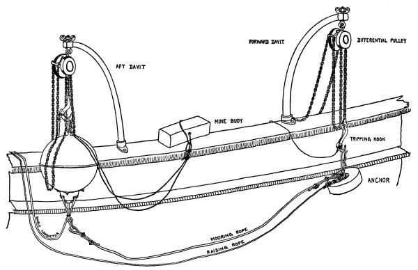 mine davit ready to throw the mine buoy clear of the planter when the mine is tripped. (Fig. 13 shows the mine and anchor slung for planting and fig. 14 shows the relative position of the various parts in the water. In these figures the cable should be shown as lashed to the mooring rope.)