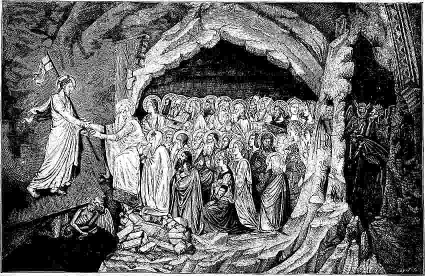 Church. Hell, or the infernal regions, was divided into four parts; the deepest, the abode of the damned; above that, Limbo, in which unbaptized children found a peaceful resting-place; the third region was Purgatory, or the place of expiation for the souls which, after having been purified by temporary punishment, are destined for Heaven; lastly, and nearest to the surface, came the Limbo of the elect, the temporary abode of the pious dead, from Abel to Christ. In this latter there was supposed to be no other punishment than that of expectant captivity. It was thither that the Redeemer descended, while his body was at rest beneath the stone of the sepulchre, awaiting the moment of His resurrection. The gracious Saviour hastened to gladden these beloved spirits with the news that his blood had washed out upon the cross the decree that had so long hung upon the children of Abraham, and that they would soon be permitted to follow Him to the skies, and at last enter into the heavenly Jerusalem.