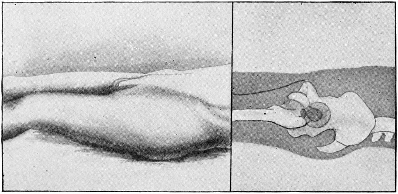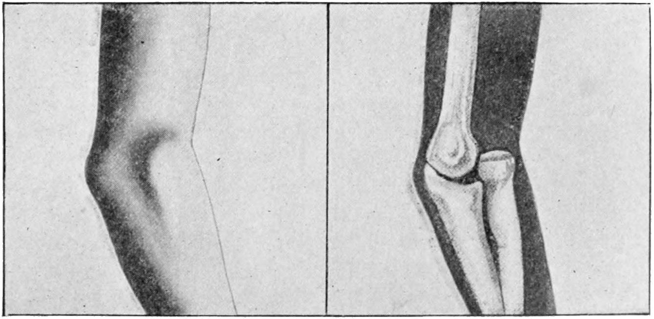 The irregularities of the elbow-joint have permitted a complicated dovetailing of its component parts which would seem to make dislocations almost impossible without fracture. Nevertheless, and especially in the tender years of childhood, both bones may be dislocated in either direction, or either bone of the forearm alone in any direction save toward the other. Diagnosis will be greatly aided by observance of the anatomical facts stated in the section on fractures of the elbow-joint and by an estimate of the relative positions occupied by these bony landmarks. When, however, intense swelling prevents this then we should either wait for its subsidence or depend upon a skiagram.