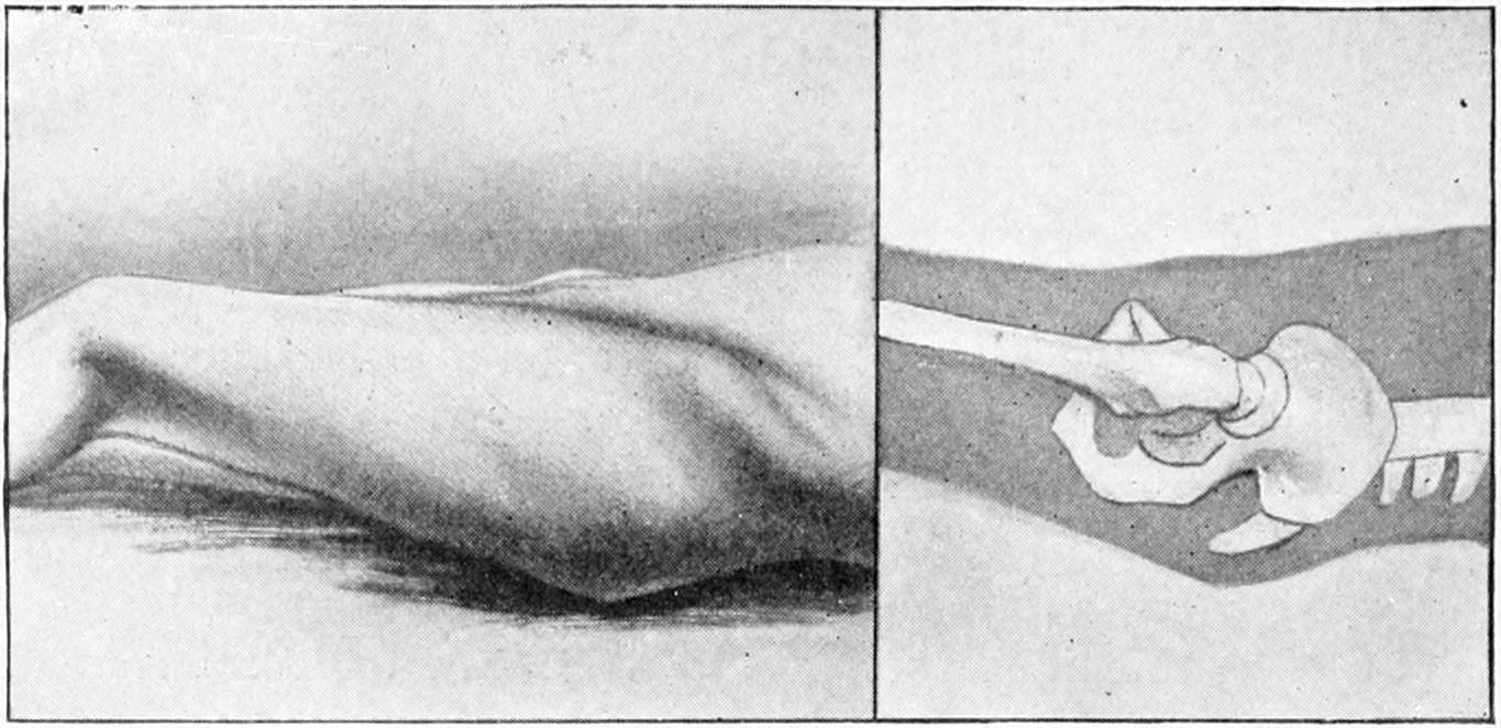 Anterior dislocation of both bones is exceedingly rare unless complicated by fractures of the olecranon. When thus injured the forearm is lengthened and fixed. The posterior surface of the humerus here has only a skin covering, the condyles are bulging, the olecranon fossa empty, and the upper ends of the forearm bones felt in front of the elbow.