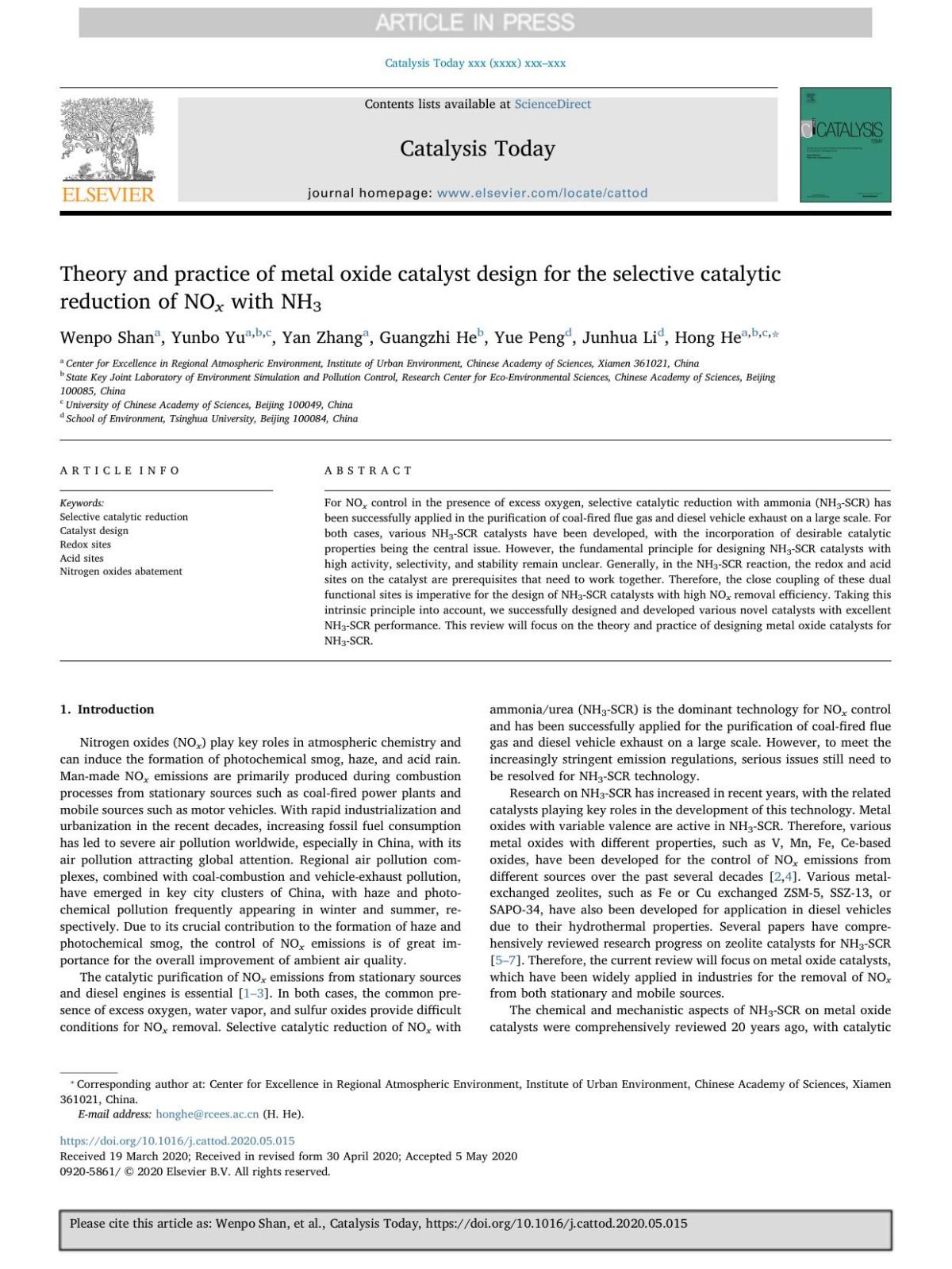 Theory and practice of metal oxide catalyst design for the selective catalytic reduction of NOx with NH3 Wenpo Shan & Yunbo Yu & Yan Zhang & Guangzhi He & Yue Peng & Junhua Li & Hong He