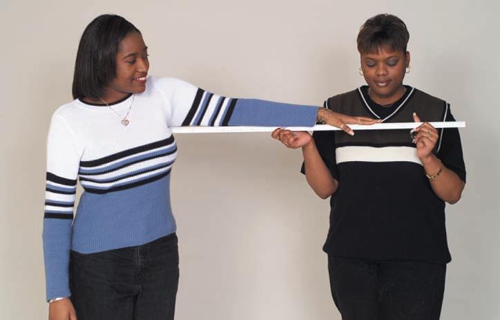 3. Use a meterstick (fig. 1.1) to measure an upper limb length of ten subjects. Place the meterstick in the axilla (armpit) and record the length in centimeters to the end of the longest finger (fig. 1.2). Obtain the height of