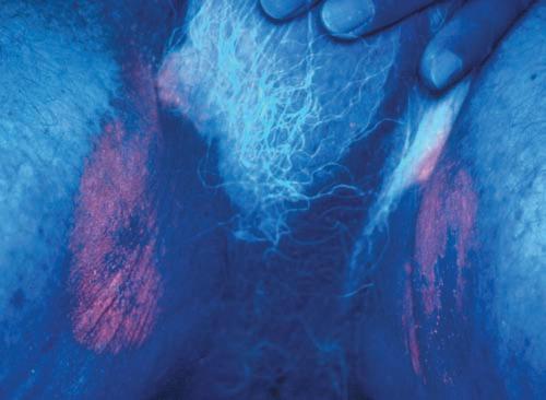 Figure 1.4 Wood’s light illumination of erythrasma of the groins. The fluorescence in erythrasma is coral pink.