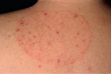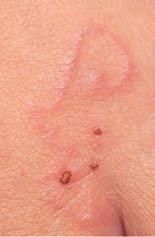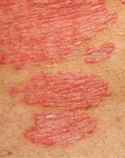 Figure 1.3 Shapes and distribution patterns of skin lesions: (a) annular: tinea cruris; (b) discoid (round): nummular eczema; (c) serpiginous: cutaneous larva migrans; (d) sporotrichoid: Mycobacterium marinum infection; (e) reticulate: lichen planus on the lower lip. (Source: (a), (b) and (c) reproduced with permission of Cardiff and Vale University Health Board.)