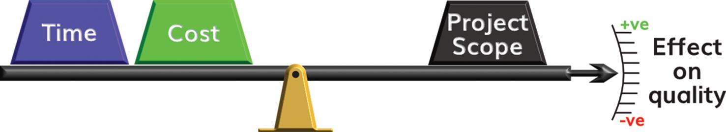 Time, cost, and quality—often thought of as a triangle—affect the scope of any project through being inextricably linked: affecting one will always have an effect on either of the other two or, will affect, either positively or negatively, the quality of the output (see