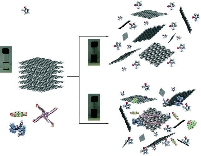Figure2.1 Schematicrepresentationofthesonicationexfoliationprocessofgraphitein theabsence(topright)andpresence(bottomright)ofsurfactantmolecules.Source: CiesielskiandSamori[3]/withpermissionfromRoyalSocietyofChemistry.