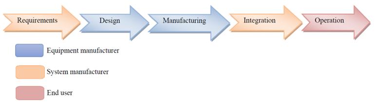– product manufacturing, conducted by the equipment manufacturer; – product integration, conducted by the system manufacturer; – product operation, conducted by the end user.