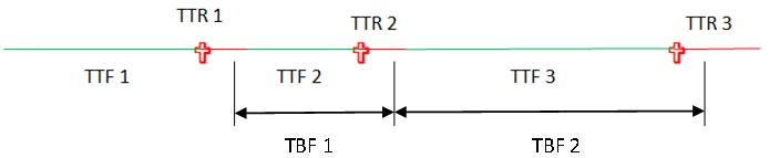 This refers to the mean time between two consecutive failures. If there are two failures, this means there was a maintenance action, as illustrated in the following figure.