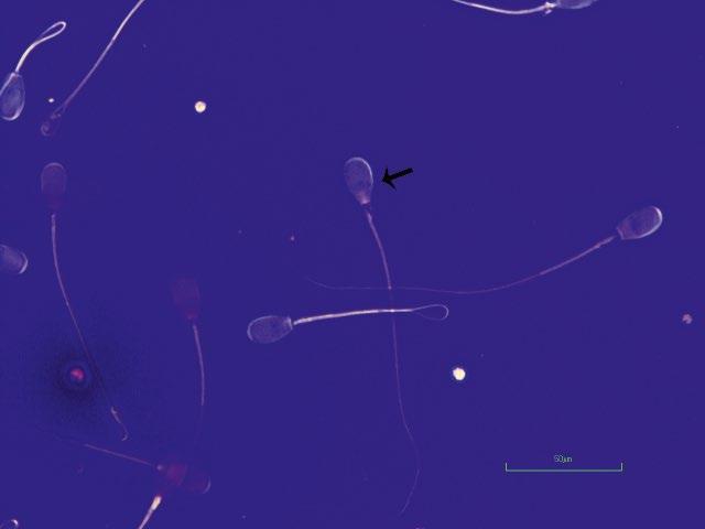 The incidence of nuclear vacuolation in the spermiogram of affected males can vary from <1% to nearly 100% [44]. When viewed using eosin–nigrosin morphology stain, vacuoles appear as dark spots in the nucleus and must be differentiated from artifacts such as stain crystals or other debris. Nuclear vacuoles are most easily spotted with phase contrast or differential interference microscopy. Feulgen staining will also reveal defects in the nuclear DNA [3]. Single or multiple vacuoles can be present anywhere in the sperm nucleus. However, they tend to be most commonly observed at the postnuclear cap-acrosome junction or near the apical ridge [55].