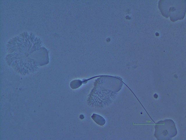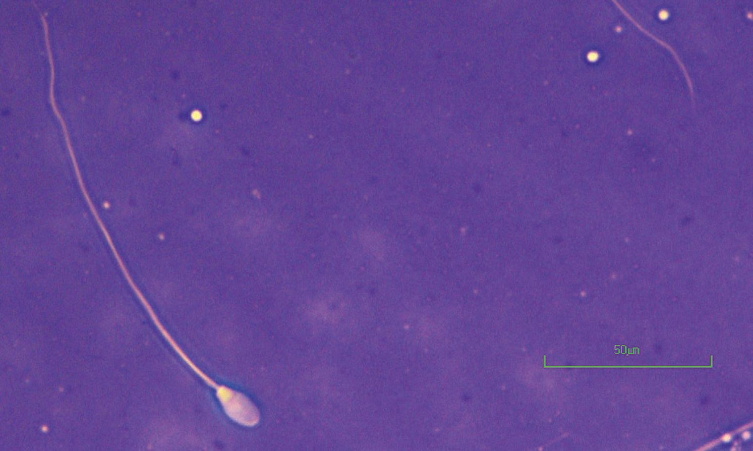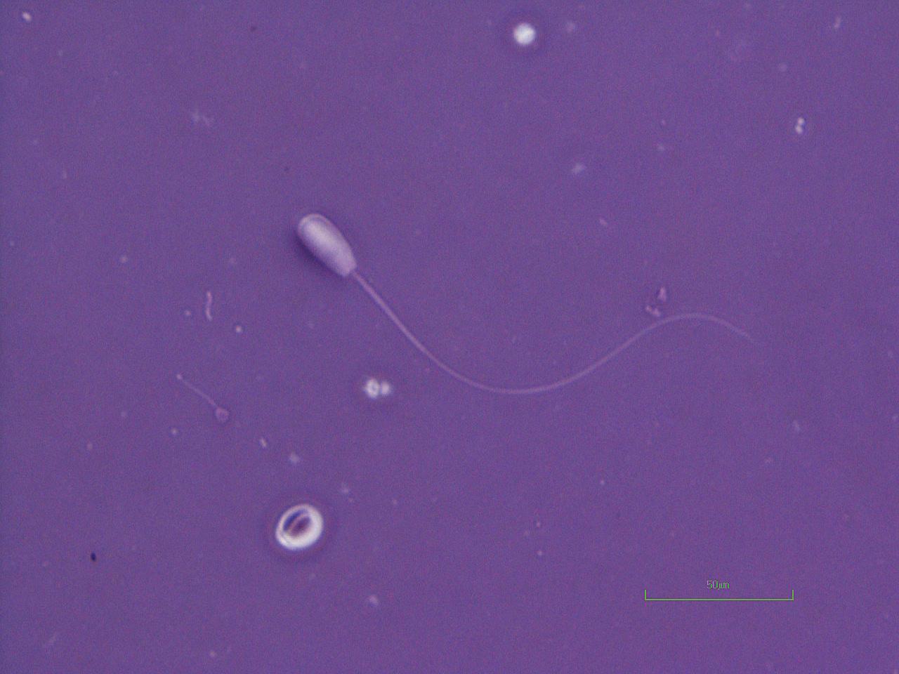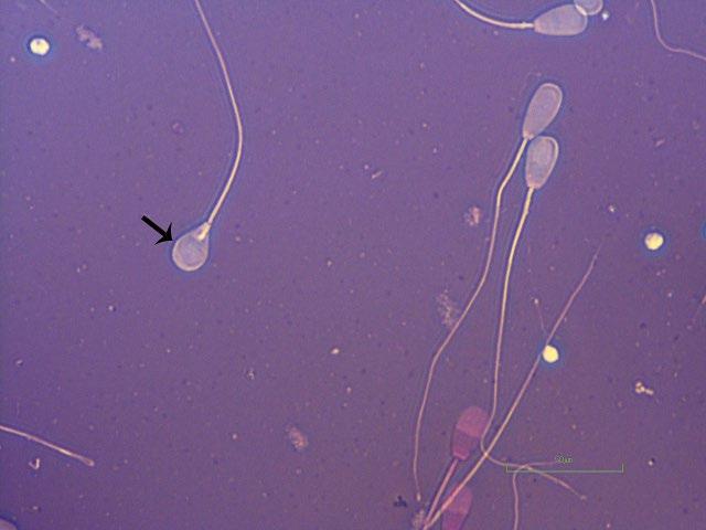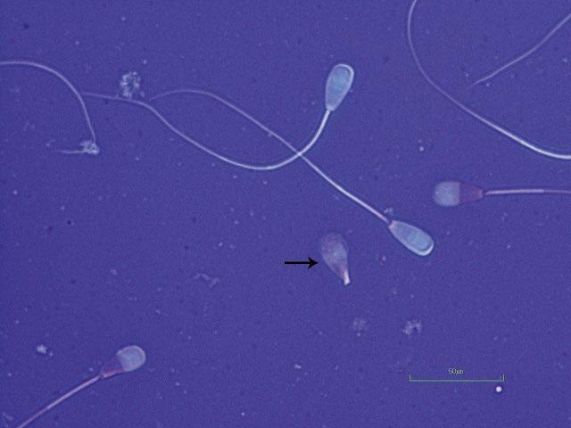 Partially stained sperm, with a pink posterior portion and a white anterior portion of the sperm head, are sometimes observed. These sperm have suffered membrane damage, yet the acrosome remained intact. This staining pattern occurs because the acrosomal membrane is tightly applied to the nucleus at the equatorial region and penetration of the eosin stain under the acrosome is initially impeded at the equatorial region [29]. Partially stained sperm are more common when semen samples are processed under less than ideal conditions, suggesting that sperm membrane damage or cell death occurred very recently (Figure I.5).