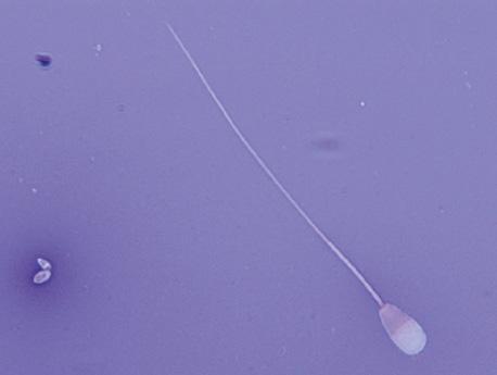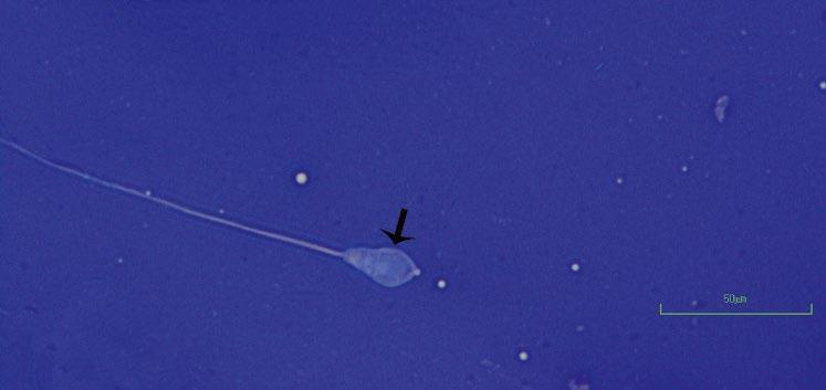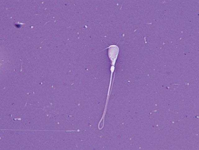 Figure I.5 Par tially stained sperm with a pink posterior and a white anterior (eosin–nigrosin, bull, 1000×).