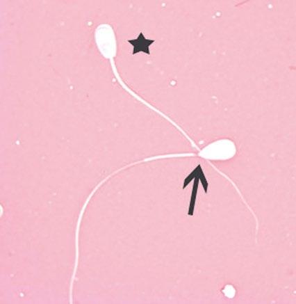 Figure 1.11 Pyriform head defect in a bull as indicated by arrow compared to normal-shaped head as indicated by star (eosin–nigrosin, 1000×).