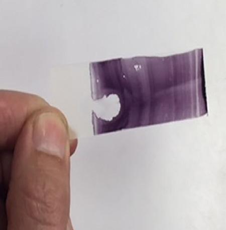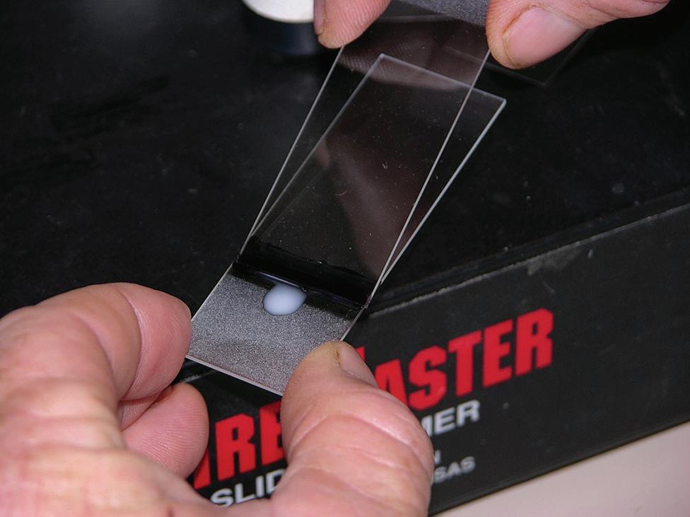 Figure I.8 Using a second slide, one can start in the stain backing up to pick up a small line of semen and then proceed to streak out the slide. There are many different methods than can be used for streaking out slides.