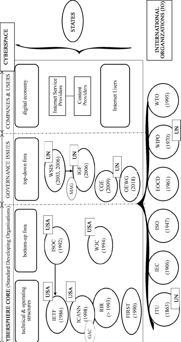 Until the 2000s, the units of the sociotechnical system that is cyberspace thus comprised the United States, the four associations of the cybersphere core and the private companies (first access providers, then content providers, but together rapidly dominated economically by the platforms) that brought the network into the market economy (Castells 2001). Although the structures constituting the cybersphere core give the impression of being global organizations, they are, in fact, an assembly of American structures that have, over time, encouraged a less American and more internationalized composition of their physical members. This has been made possible by foreign contributions to the definition of computer-to-computer communication standards, which has valued the principle of openness (Russell 2014). However, US computer companies and their members have been, and remain, central (Raustalia 2016) to the composition of these various structures, from which states are absent (DeNardis and Raymond 2013). As Laura DeNardis (DeNardis 2016) and Francesca Musiani (Musiani 2018) have clearly shown, the choices of physical and logical infrastructures are political choices.