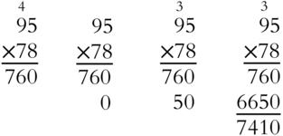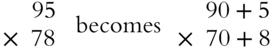 Don't get discouraged, because there is a condensed form. The first set of numbers we'd multiply would be 8 × 5. You probably know, or can figure out, that's 40. (We'll focus on all the multiplication facts you should memorize in Chapter 3, “Focus on Multiplication.”) Then we'd multiply 8 × 90, which just means multiplying 8 × 9 and putting a zero at the end. Whenever you multiply a number that ends in zero, you can deal with the non-zero parts and add the zero at the end. (See Chapter 5, “Mental Math” for more on that shortcut.) 8 × 9 =72 so 8 × 90 = 720. Next would come 70 × 5. 7 × 5 = 35 so 70 × 5 =350. The last multiplication would be 70 × 90. Multiply 7 × 9 = 63, and then add a zero for the 70 and another zero for the 90. 70 × 90 = 6,300. Add up 6,300 + 350 + 720 + 40 to get 7,410.