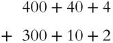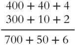 Add the 4 ones and the 2 ones to get 6 ones, the 4 tens with 1 ten to get 5 tens and the 4 hundreds with 3 hundreds to get 7 hundreds. Now that would look like this: