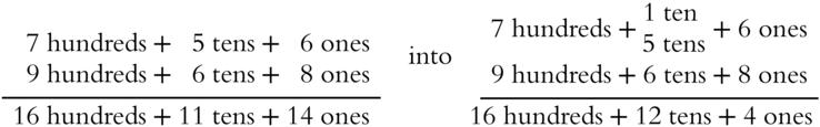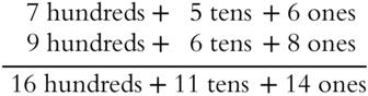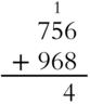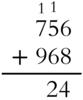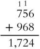 But you can't squeeze 16 (or 11 or 14) into one place. 756 + 968 does not equal 161114. You've got to do some regrouping, or what's commonly called carrying. Those 14 ones equal 1 ten and 4 ones.