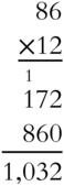 Find the product of 86 and 12.