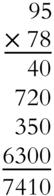 Here's how to write it more compactly. Multiply 8 × 5 = 40, put down the 0 and carry the 4. 8 × 9 = 72 and the 4 we carried makes 76. Write the 76 in front of that 0 you put down and you see 760. This 760 is the 40 and the 720 combined. Now, you need to multiply 95 by 70, which means multiply by 7 and add a zero. So put the zero down first, under the 0 of the 760. Then 7 × 5 = 35. Put down the 5 to the left of the 0 and carry the 3. 7 × 9 = 63 plus the 3 you carried is 66. Write the 66 in front of the 50 and you've got 6,650, which is the 350 and 6300 combined. Add the two lines, and you're done.