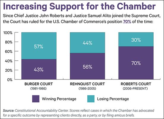 Meanwhile, the Supreme Court has become a reliable bulwark for corporate interests, with justices ruling with the Chamber more than 83 percent of the time during its most recent term.