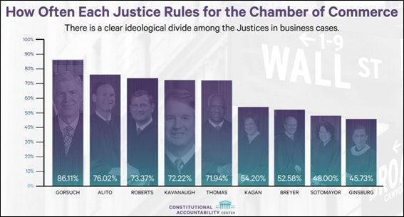 This tracks with the current court siding with the Chamber 70 percent of the time overall, according to data compiled by the Constitutional Accountability Center