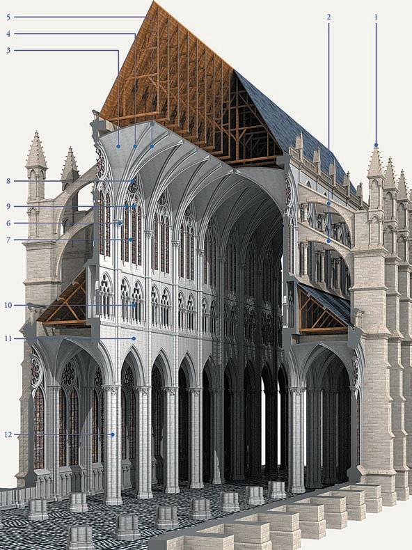 Cutaway view of a typical French Gothic cathedral (1) pinnacle, (2) flying buttress, (3) vaulting web, (4) diagonal rib, (5) transverse rib, (6) springing, (7) clerestory, (8) oculus, (9) lancet, (10) triforium, (11) nave arcade, (12) compound pier with responds