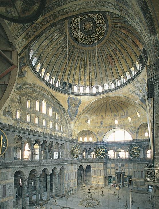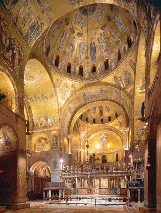join to form a ring and four arches whose planes bound a square. The fi rst use of pendentives on a grand scale occurred in the sixthcentury church of Hagia Sophia (Holy Wisdom) in Constantinople. The interiors of Byzantine churches differed from those of basilican churches in the West not only in plan and the use of domes but also in the manner in which they were adorned. The original mosaic decoration of Hagia Sophia is lost, but at Saint Mark’s in Venice, some 40,000 square feet of mosaics cover all the walls, arches, vaults, and domes.
