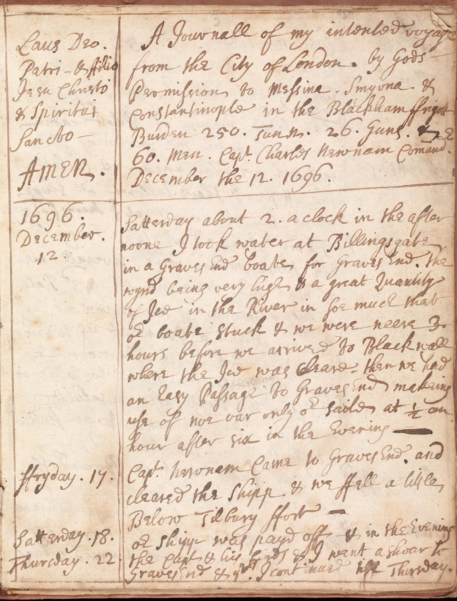 Plate 1. The first page of Looker’s ‘Journall’ that records ‘my intented voyage from the City of London, by Gods Permission, to Messina, Smyrna & Constantinople in the Blackham Frigott’ and his departure from England in December 1696. Courtesy of the NMM, Greenwich, London.