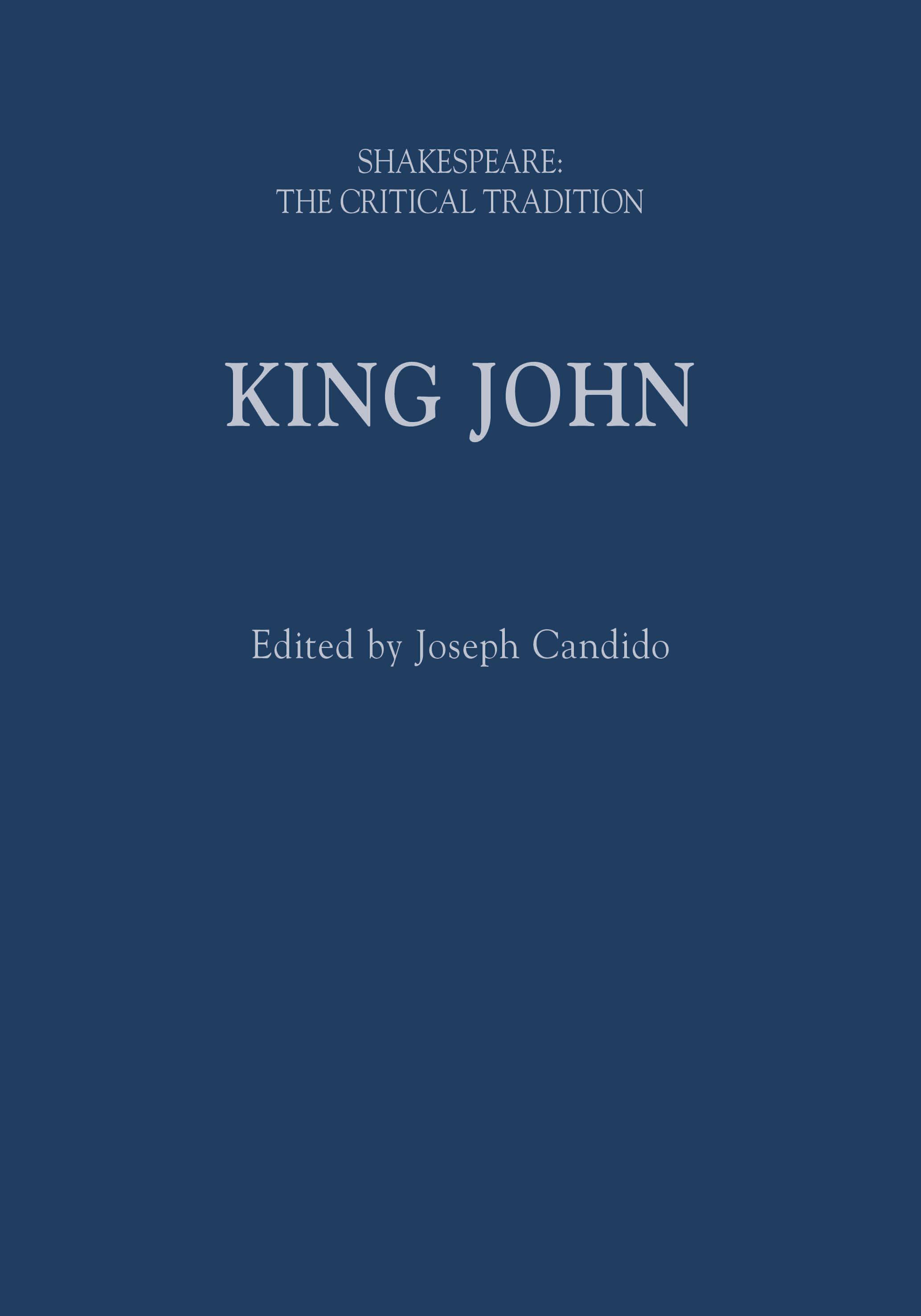 The aim of the present volume is to extend the work of historical scholarship begun by Brian Vickers in his Shakespeare: The Critical Heritage, 6 vols (London, 1974–81) by providing a detailed examination of critical response to King John in the period 1790 to 1920. In accordance with the rubrics of the series, the emphasis is on the English rather than the continental tradition; hence included among the printed texts are only those volumes of continental criticism that, by virtue of being translated into English, have had a substantial influence upon scholarship written in English. Also, in accordance with the rubrics of the series, scholarship dealing exclusively with theatrical history has been excluded, except when material of this sort raises issues about King John of a literary or interpretive nature, or when it seems in some way to reflect or direct the critical tradition.