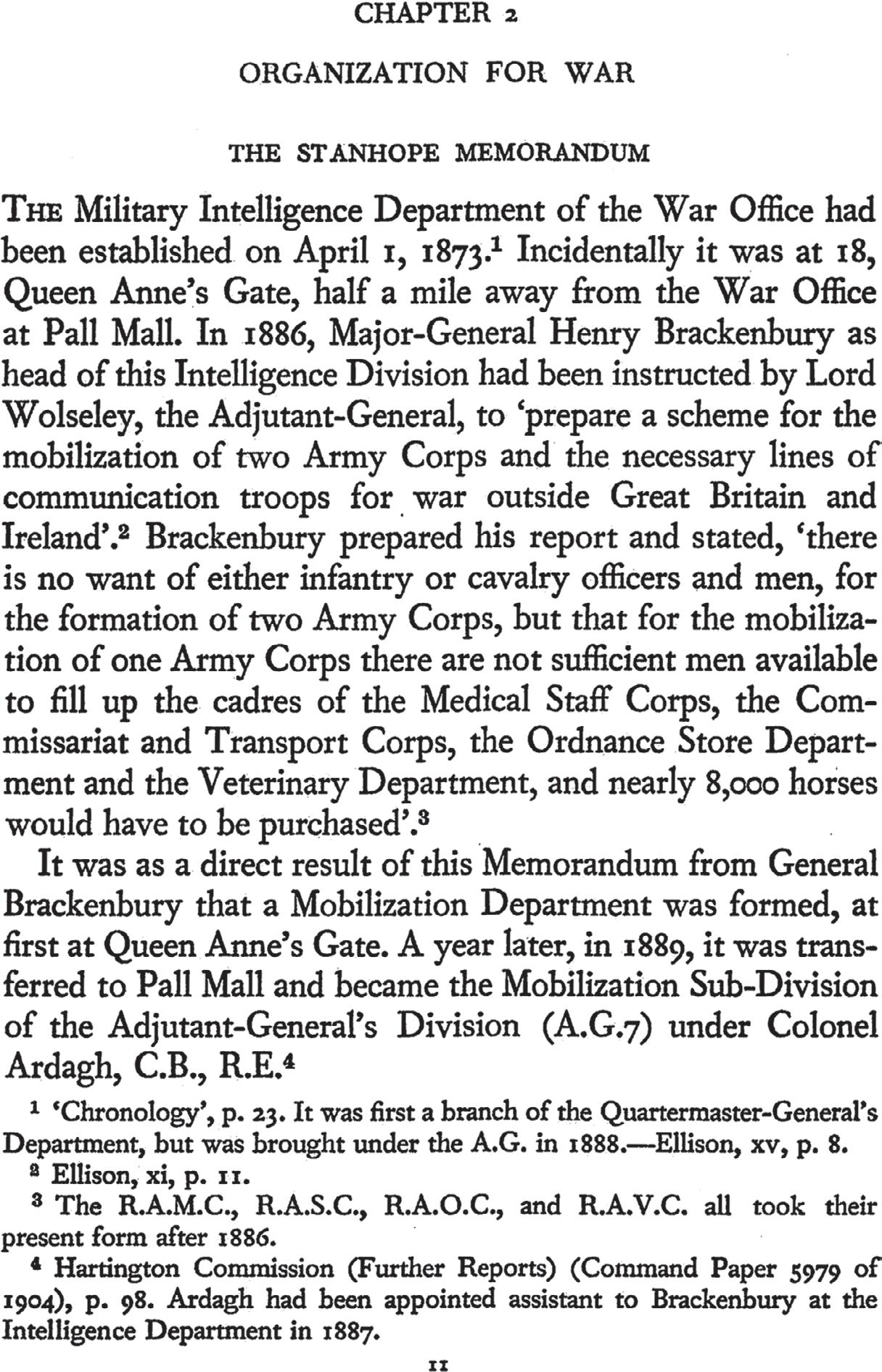 THE Military Intelligence Department of the War Office had been established on April 1, 187j.1 Incidentally it was at 18, Queen Anne's Gate, half a mile away from the War Office at Pall Mall. In 1886, Major-General Henry Brackenbury as head of this Intelligence Division had been instructed by Lord Wolseley, the Adjutant-General, to 'prepare a scheme for the mobilization of two Army Corps and the necessary lines of communication troops for . war outside Great Britain and lreland'. 2 Brackenbury prepared his report and stated, 'there is no want of either infantry or cavalry officers and men, for the formation of two Army Corps, but that for the mobilization of one Army Corps there are not sufficient men available to fill up the cadres of the Medical Staff Corps, the Commissariat and Transport Corps, the Ordnance Store Department and the Veterinary Department, and nearly 8,000 horses would have to be purchased'. 8 .