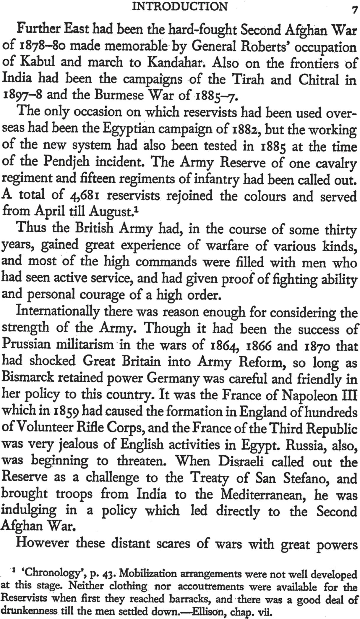 Internationally there was reason enough for considering the strength of the Army. Though it had been the success of Prussian militarism ·in the wars of 1864, 1866 and 1870 that had shocked Great Britain into Army Reform, so long as Bismarck retained power Germany was careful and friendly in her policy to this country. It was the France of Napoleon Ill which in 1859 had caused the formation in England of hundreds of Volunteer Rifle Corps, and the F ranee of the Third Republic was very jealous of English activities in Egypt. Russia, also, was beginning to threaten. When Disraeli called out the Reserve as a challenge to the Treaty of San Stefano, and brought troops from India to the Mediterranean, he was indulging in a policy which led directly to the Second Afghan War.