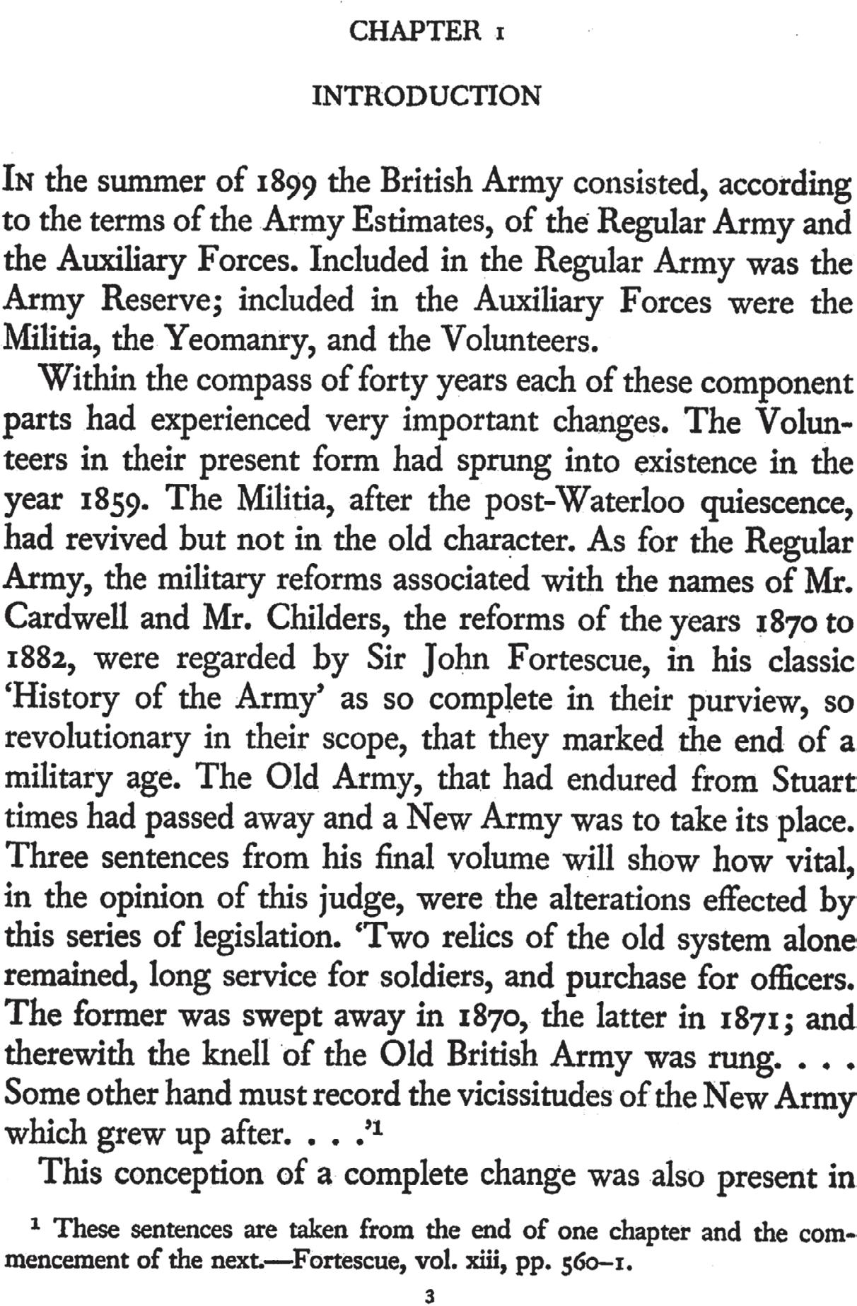Within the compass of forty years each of these component parts had experienced very important changes. The Volunteers in their present form had sprung into existence in the year 1859. The Militia, after the post-Waterloo quiescence, had revived but not in the old character. As for the Regular Army, the military reforms associated with the names of Mr. Cardwell and Mr. Childers, the reforms of the years 1870 to 1882, were regarded by Sir John Fortescue, in his classic 'History of the Army' as so complete in their purview, so revolutionary in their scope, that they marked the end of a military age. The Old Army, that had endured from Stuart times had passed away and a New Army was to take its place. Three sentences from his final volume will show how vital, in the opinion of this judge, were the alterations effected by this series of legislation. 'Two relics of the old system alone remained, long service for soldiers, and purchase for officers. The former was swept away in 1870, the latter in 1871; and therewith the knell of the Old British Army was rung•••• Some other hand must record the vicissitudes of the New Army which grew up after.•••' 1