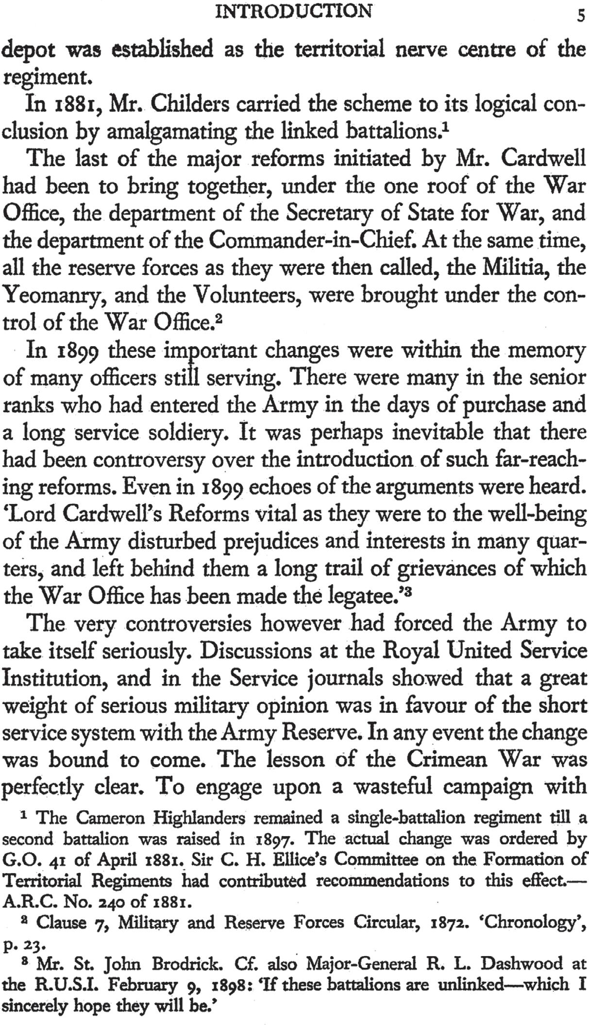 The last of the major reforms initiated by Mr. Cardwell had been to bring together, under the one roof of the War Office, the department of the Secretary of State for War, and the department of the Commander-in-Chief. At the same time, all the reserve forces as they were then called, the Militia, the Yeomanry, and the Volunteers, were brought under the control of the War Office. 2