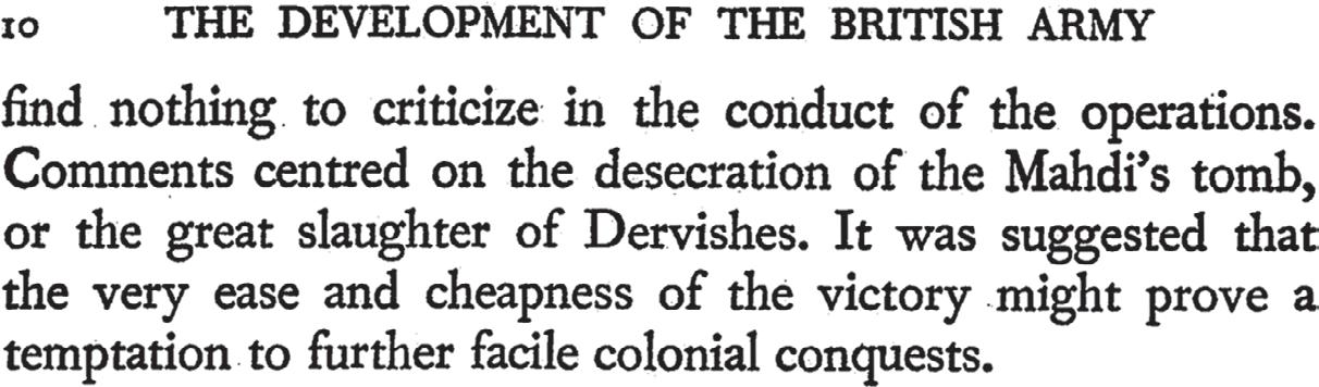 find . nothing . to criticize in the conduct of the operations. Comments centred on the desecration of the Mahdi's tomb, or the great slaughter of Dervishes. It was suggested that the very ease and cheapness of the victory might prove a temptation .to further facile colonial conquests.