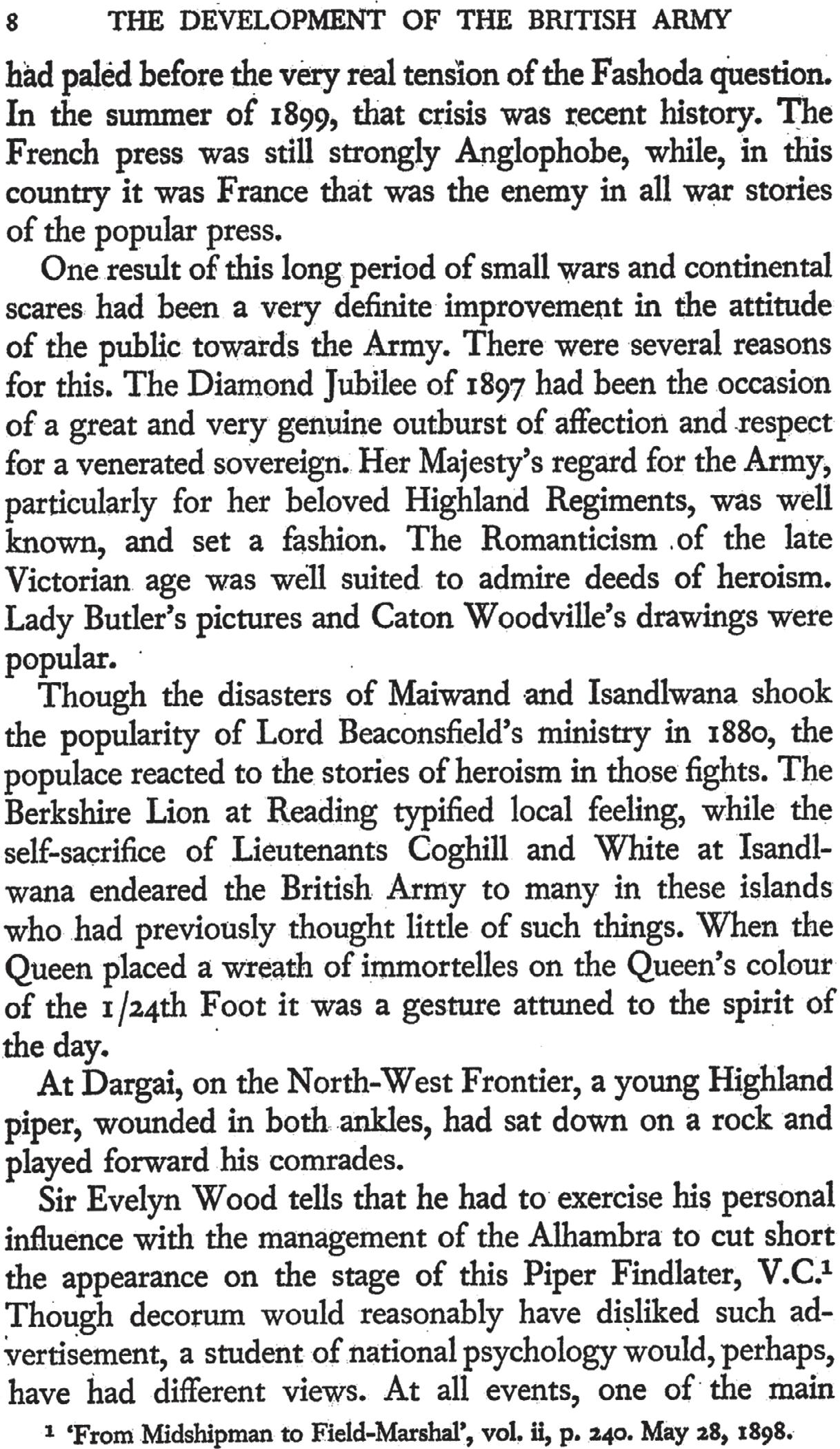 One .result of this long period of small wars and continental scares had been a very definite improvement in the attitude of the public towards the Army. There were several reasons for this. The Diamond Jubilee of 1897 had been the occasion of a great and very genuine outburst of affectiort and .respect for a venerated sovereign. Her Majesty's regard for the Army, particularly for her beloved Highland Regiments, was well known, and set a fashion. The Romanticism .of the late Victorian age was well suited to admire deeds of heroism. Lady Butler's pictures and Caton Woodville's drawings were popular. ·