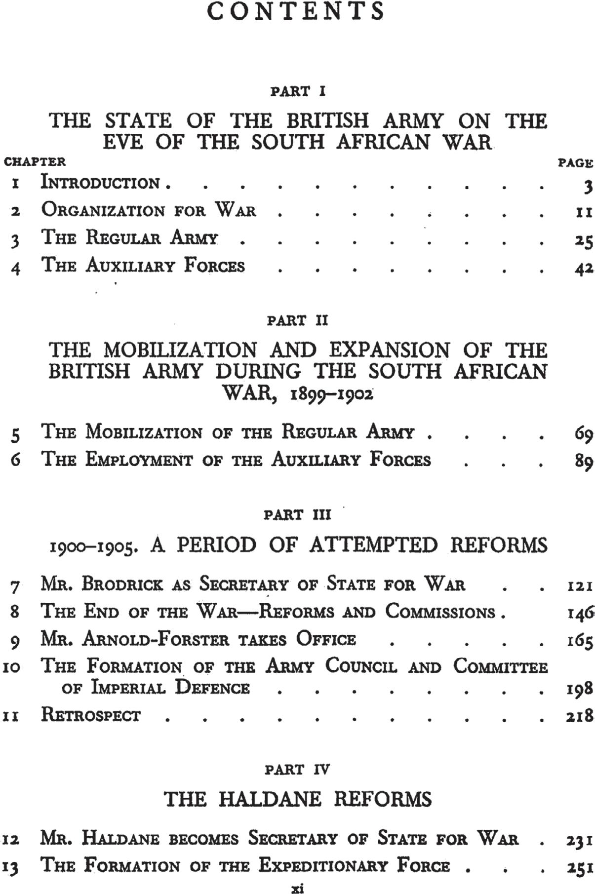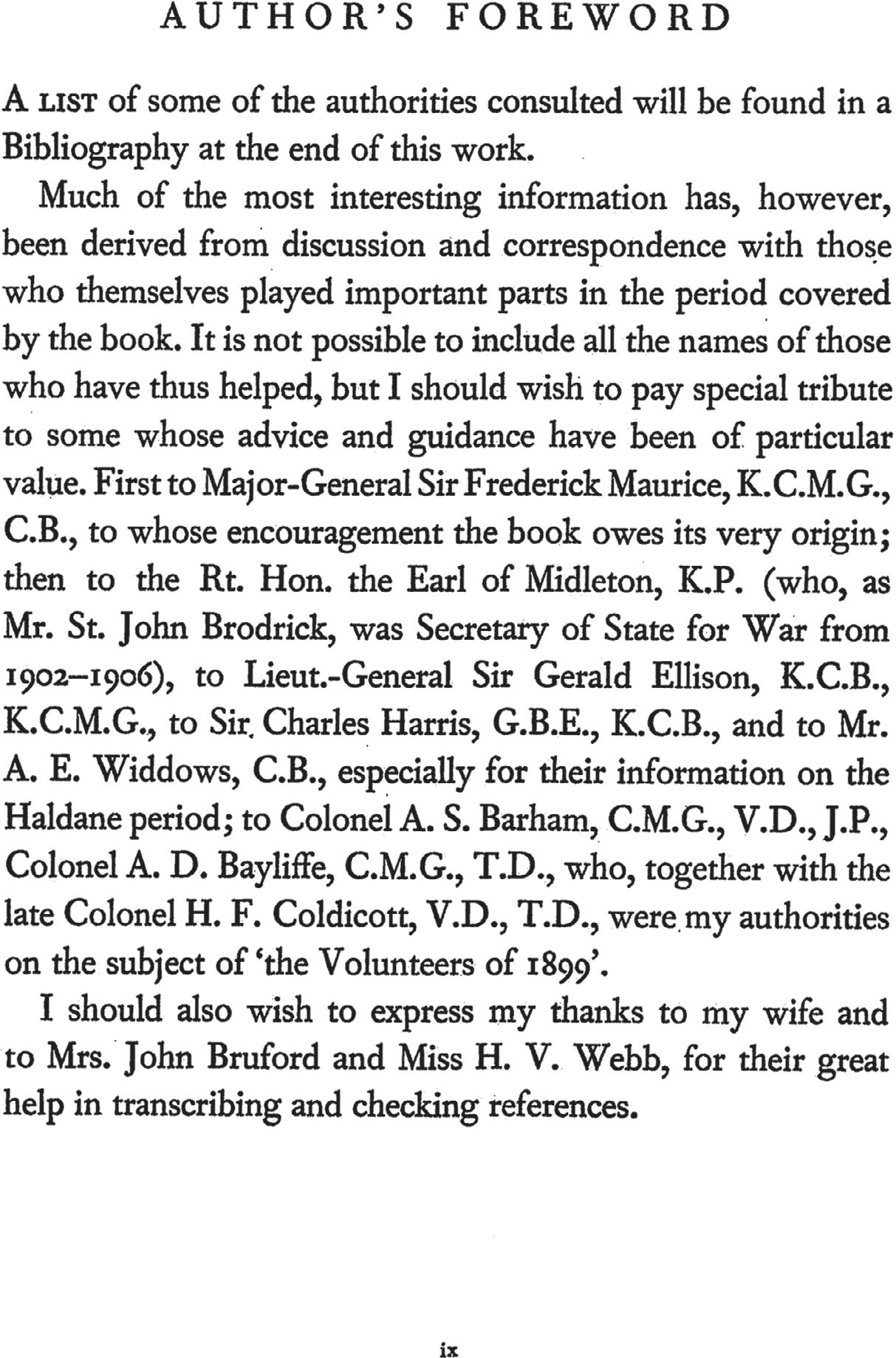 Much of the most interesting information has, however, been derived from discussion and correspondence with tho~e who themselves played important parts in the period covered by the book. It is not possible to include all the names of those who have thus helped, but I should wish to pay special tribute to some whose advice and guidance have been of particular value. First to Major-General Sir Frederick Maurice, K.C.M.G., C.B., to whose encouragement the book owes its very origin; then to the Rt. Hon. the Earl of Midleton, K.P. ( who, as Mr. St. John Brodrick, was Secretary of State for War from 1902-1906), to Lieut.-General Sir Gerald Ellison, K.C.B., K.C.M.G., to Sir. Charles Harris, G.B.E., K.C.B., and to Mr. A. E. Widdows, C.B., especially for their information on the Haldane period; to Colonel A. S. Barham, C.M.G., V.D., J.P., Colonel A. D. Bayliffe, C.M.G., T.D., who, together with the late Colonel H.F. Coldicott, V.D., T.D., were .my authorities on the subject of 'the Volunteers of 1899'.