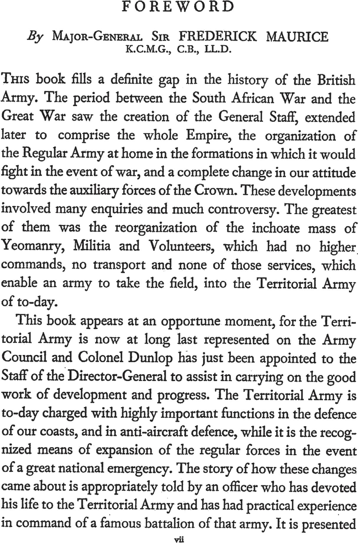 This book appears at an opportune moment, for the Territorial Army is now at long last represented on the Army Council and Colonel Dunlop has just been appointed to the Staff of the·Director-General to assist in carrying on the good work of development and progress. The Territorial Army is to-day charged with highly important functions in the defence of our coasts, and in anti-aircraft defence, while it is the recognized means of expansion of the regular forces in the event of a great national emergency. The story of how these changes came about is appropriately told by an officer who has devoted his life to the Territorial Army and has had practical experience in command of a famous battalion of that army. It is presented vii