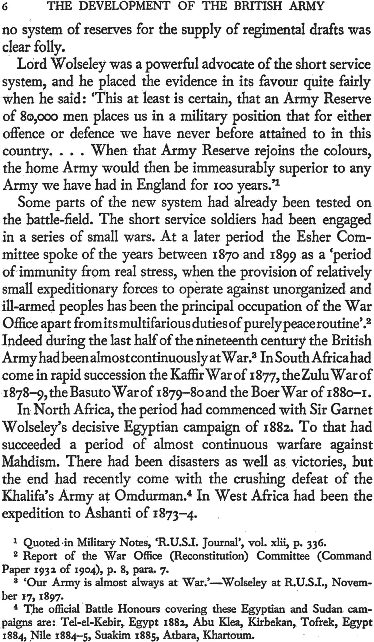 Some parts of the new system had already been tested on the battle-field. The short service soldiers had been engaged in a series of small wars. At a later period the Esher Committee spoke of the years between 1870 and 1899 as a 'period ofimmunity from real stress, when the provision of relatively small expeditionary forces to operate against unotganized and ill-armed peoples has been the principal occupation of the War Office apart from its multifarious duties of purelypeaceroutine'.2 Indeed during the last half of the nineteenth century the British Army hadbeenalmostcontinuouslyat W ar.3 In South Africa had come in rapid succession the Kaffir War of 1877, the Zulu W arof 1878-9, the Basuto W arof 1879-8oand the Boer War of 1880-1.
