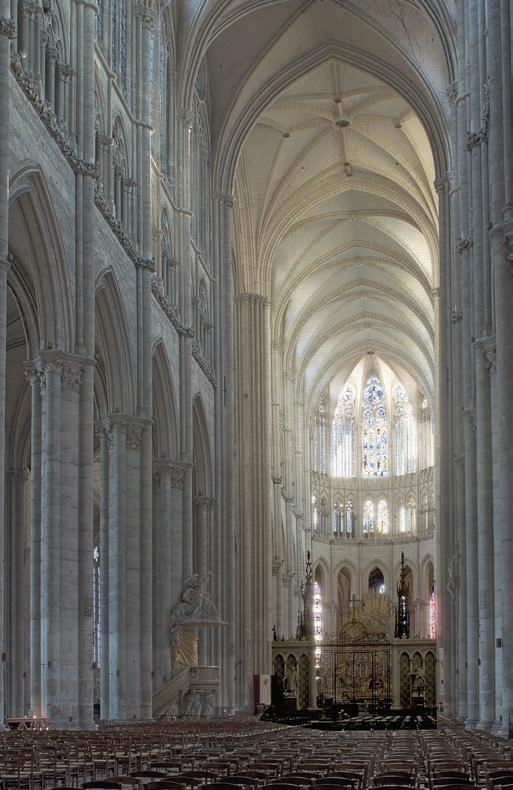ponents of Gothic design are labeled in the drawing of a typical French Gothic cathedral, which can be compared to the interior view of Amiens Cathedral and the plan of Chartres Cathedral. Gothic architects frequently extended the aisles around the apse to form an ambulatory, onto which opened radiating chapels housing sacred relics. Groin vaults formed the ceiling of the nave, aisles, ambulatory, and transept alike, replacing the timber roof of the typical Early Christian basilica. These vaults rested on diagonal and transverse ribs in the form of pointed arches. On the exterior, flying buttresses held the nave vaults in place. These masonry struts transferred the thrust of the nave vaults across the roofs of the aisles to tall piers frequently capped by pointed ornamental pinnacles. This structural system made it possible to open up the walls above the nave arcade with huge stained-glass windows in the nave clerestory.