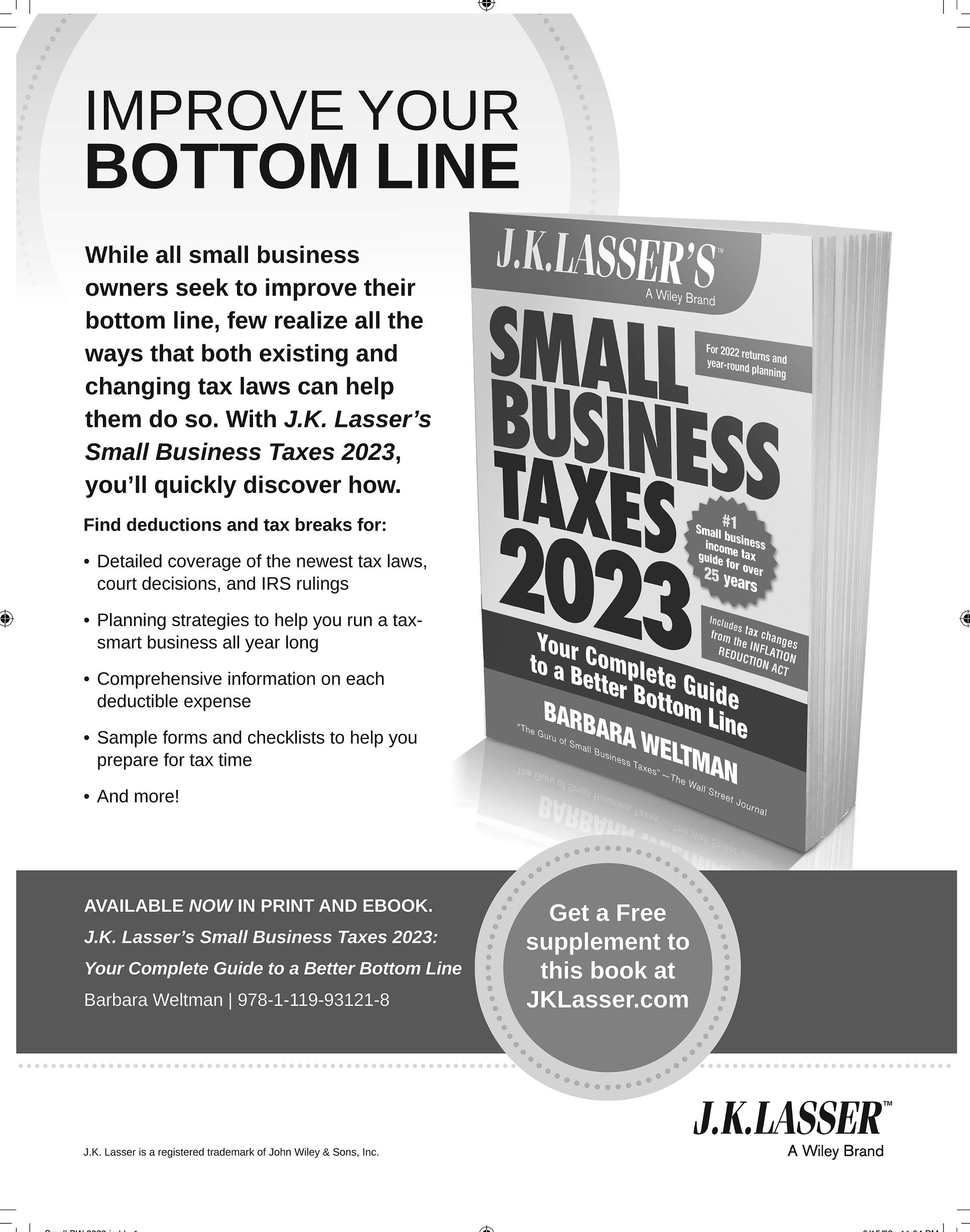 You can download a free e-Supplement to Your Income Tax 2023 at jklasser�com. The e-Supplement will provide an update on tax developments from the IRS and Congress, including a look ahead to 2023. On the homepage at jklasser com, you will find free tax news, tax tips and tax planning articles.