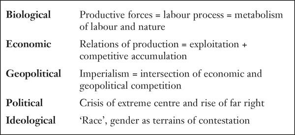 The reference to historical method isn’t just a rhetorical flourish. ‘Always historicize!’, as Jameson famously put it.39 This book historicizes in two ways: first and more generally, I trace the roots of the multiple crises, which is necessarily a historical undertaking; secondly, I develop a systematic historical comparison between the present historical moment and the first age of catastrophe (1914–45), an era of inter-imperialist wars and revolutions in which classical fascism developed and made its disastrous bid for global dominance.