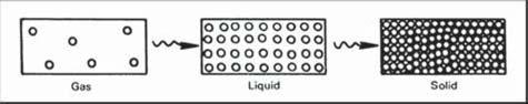 one wave or one cycle of movement. Each cycle consists of two parts: a compression, where the molecules are pushed closer together, and a rarefaction, where they are spread wider apart (Figure 1-4). The molecules, as they are squeezed together and separated, cause changes in the pressure within the medium. Similarly, molecules undergoing compression and rarefaction show variations in density. Density is defined as mass per unit volume. Particle motion is the back-and-forth motion of the molecules in the medium, and its units are that of distance, in millimeters.