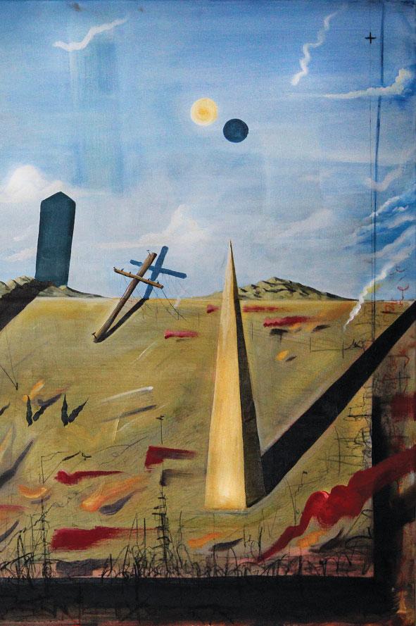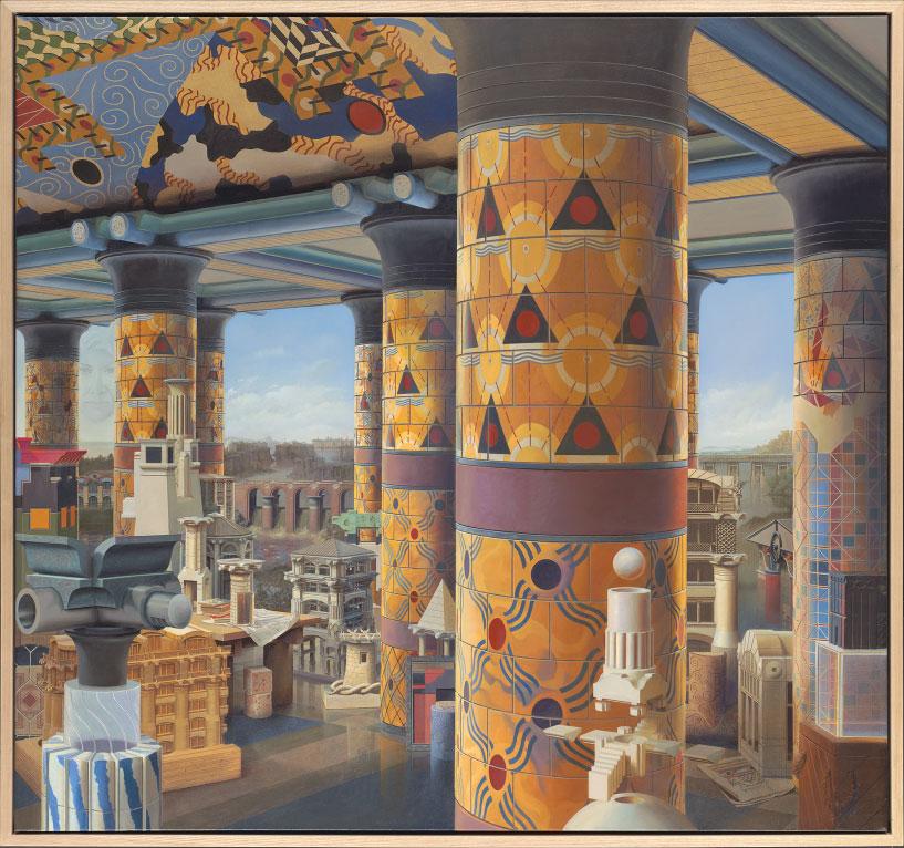 Like Zoe Zenghelis’s recent work, architectural designer and artist Nick Wilkey is interested in a painterly representation of archetypal architectural elements that are abstracted to a powerful yet simple geometry. Wilkey often sets his tableaux in a deep-horizon, Surrealist ground.